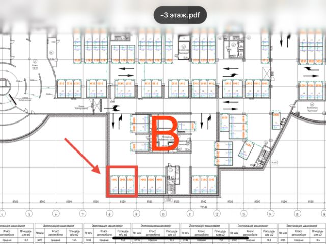 Лучшие 3 машиноместа под башней В: -ближайшие к лифту -отдельный бетонный бокс глубиной 8.6 метров -ширина 2.4-2.7 метров -уровень -3 -можно сделать отгороженную кладовку за автомобилем