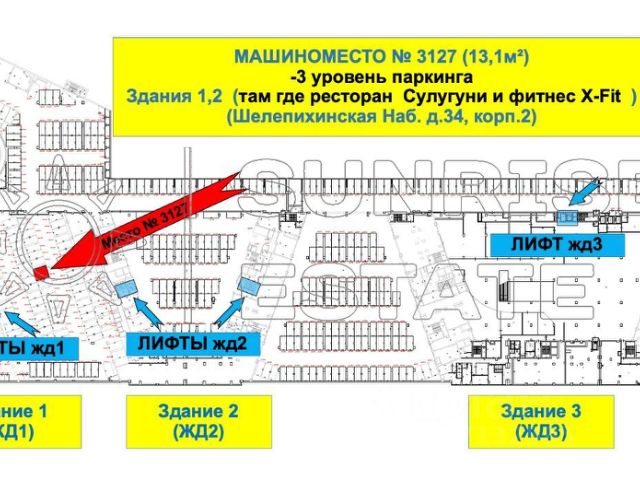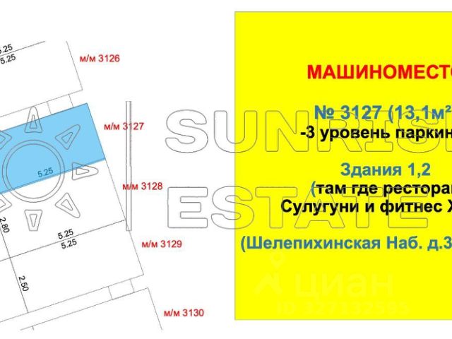 Уникальное предложение! Продается ОДНО машиноместо! Место 3127 расположенно на -3 уровне паркинга. Площадь 13,1м² (ширина 2,5м / длинна 5,25м) ОСОБЕННО удобно для жильцов Здания 1 и Здания 2. Для жильцов здания 3 также подходит. адрес расположения Шелепихинская Наб. д.34, корп.2 (Здание 1,2,3) Въезд в паркинг Р2 (с улицы Шеногина) -один виток вниз по спирали!