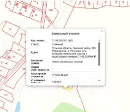 продажа земельного участка из земель населенных пунктов с кадастровым номером 71:09:030101:1429, площадь 428 кв. м, адрес: Тульская область, Заокский район, МО Страховское, д. Рязаново, юго-западнее земельного участка с кадастро...
