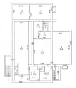 Продается нежилое помещение общ. пл. 52кв.м, 1 й эт. , высота потолка 3.2м, отдельный вход, с/у. Отдельный кадастр ( НЕ ДОЛЯ !). Возможна продажа большей площади до 105 кв.м. На плане блок выделен синим цветом.