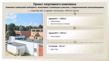 Комплекс, состоящий из трех отдельно стоящих зданий, расположенные на земельном участке площадью 9094 м2 в МО г. Королев ул. Пролетарская Здание - площадь 1585,2 м2, 1 этаж и 1 подземный этаж , здание действующее - спортивный зал с раздевалкой, санузлом, в насто...