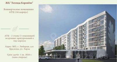 Продается двухэтажный ТЦ в ЖК "Легенда Коренёво". Помещение встроенно-пристроенное, свободного назначения. Срок сдачи объекта 1 квартал 2026 года. Адрес: МО, г. Люберцы, д.п. Красково, ул. Лорха. Расположено на первой линии от дороги.
