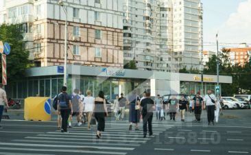Первый этаж стилобата, вход с улицы рядом с остановкой.