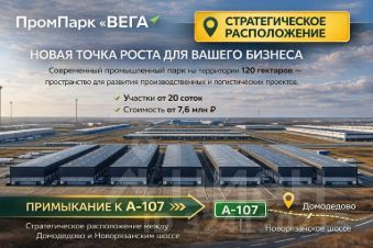 Предлагаем участки промышленного назначения в промпарке Вега (Раменский г.о. Московской области) идеальную базу для производства, логистики или склада. Находится напротив действующего промпарка А-107.