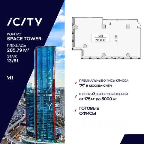 Предлагается офисное помещение площадью 289.00 м² на 13 этаже в башне Space Tower в деловом небоскребе iCITY.