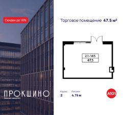 Продаётся торговое помещение площадью 47.5 кв. м. в Бизнес-квартал "Прокшино". Без отделки. Окна с видом на улицу. Высота потолков 4.75 м. Выделенная электрическая мощность — 10 кВт. Отдельный вход с улицы. Стоимость помещения — 29 410 100 руб. Способы оплаты и...