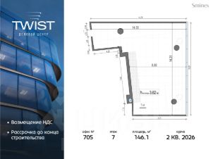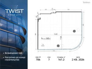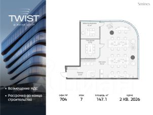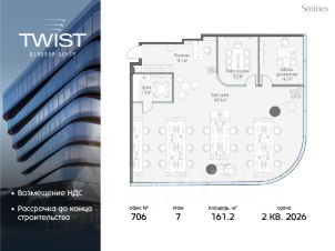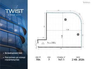 Видовой офис площадью 161.2 кв. м. с панорамным остеклением на две стороны света: юг и восток. Свободная планировка и минимальное количество несущих конструкций позволяют максимально эффективно зонировать пространство. Панорамное остекление обеспечивает максималь...