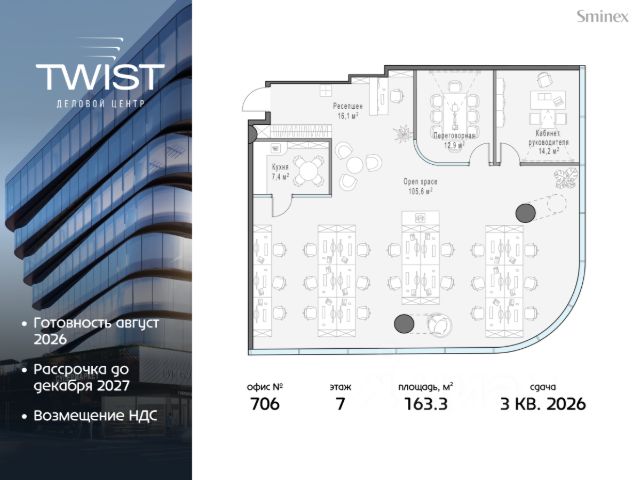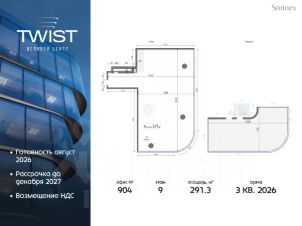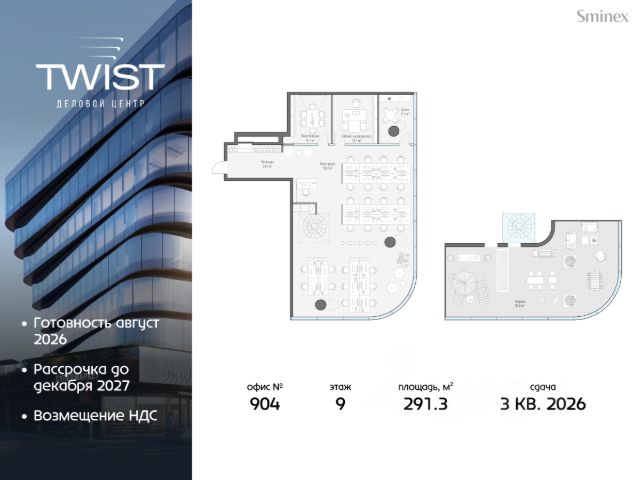 Готовность в августе 2026. Рассрочка до декабря 2027. Видовой офис площадью 291.3 кв.м. c собственной террасой на крыше.
