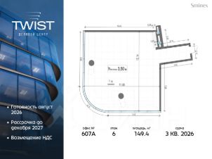 Готовность в августе 2026. Рассрочка до декабря 2027. Видовой офис площадью 149.40 кв. м. с панорамным остеклением ориентирован на Бутырскую улицу. Правильная форма и минимальное количество несущих конструкций позволяют максимально эффективно зонировать пространс...