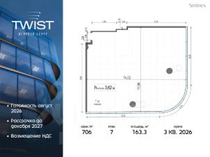 Готовность в августе 2026. Рассрочка до декабря 2027. Видовой офис площадью 163.3 кв. м. с панорамным остеклением на две стороны света: юг и восток. Свободная планировка и минимальное количество несущих конструкций позволяют максимально эффективно зонировать прос...