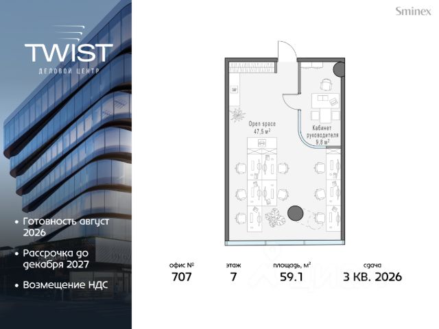 Готовность в августе 2026. Рассрочка до декабря 2027. Видовой офис площадью 308.90 кв.м. c собственной террасой на крыше.