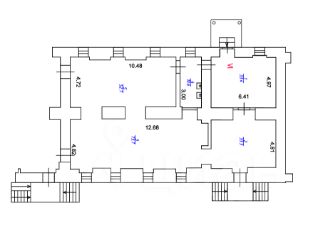 Площадь 34,1 кв.м, ( 4 на плане), офисная отделка, полноценное окно. В помещении все коммуникации, можно организовать свой санузел.
