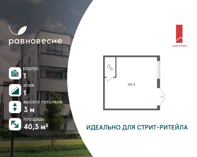 Продаётся коммерческое помещение на 1-м этаже ЖК комфорт-класса "Равновесие" ОТ ЗАСТРОЙЩИКА общей площадью 40,30 кв.м и стоимостью 10075000 рублей.
