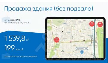 Предлагается к продаже нежилое отдельностоящее здание площадью 1 539,8 м2. Здание расположено в ВАО, по адресу - ул. Вольная, д. 35, стр. 8, на территории производственно-складского комплекса. Здание кирпичное, 3-этажное, без подвала. Высота потолков от 3 до 8 ме...