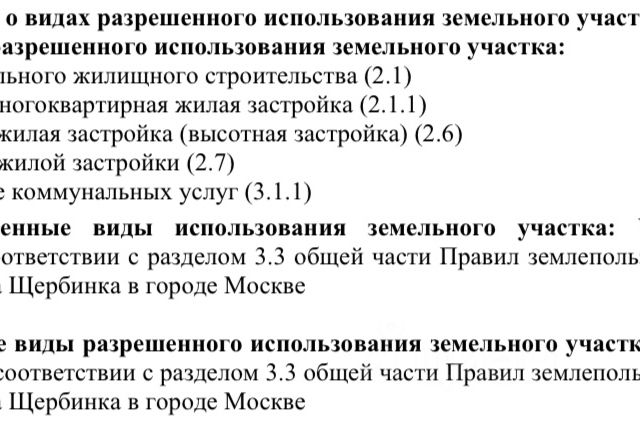 Продажа земельного участка Основные ВРИ : - Для индивидуального жилищного строительства (2.1) - Малоэтажная многоквартирная жилая застройка (2.1.1) - Многоэтажная жилая застройка (высотная застройка) (2.6)Обслуживание жилой застройки (2.7) * Предоставление коммунальных услуг (3.1.1) * * Условные / вспомогательные Устанавливаются применяются в соответствии с разделом 3.3 общей части Правил землепользования и застройки городского округа Щербинка в городе Москве На участке находится жилой дом . Участок правильной квадратной формы . 1 взрослый собственник . ГПЗУ есть . 920 кв.м Центральный газ , вода , свет .