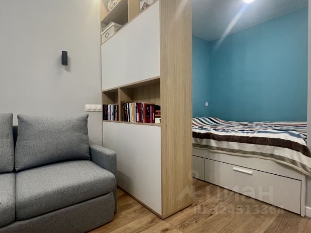 20-ти метровая комната разделена декоративной перегородкой на 2 зоны спальню и гостиную.