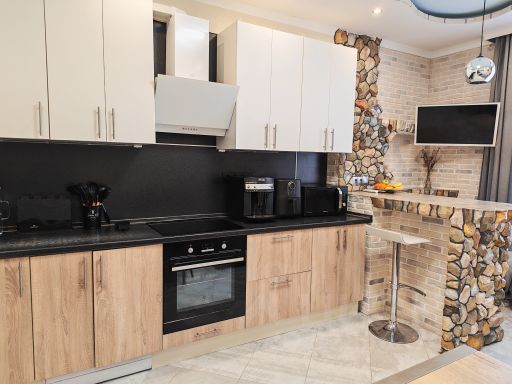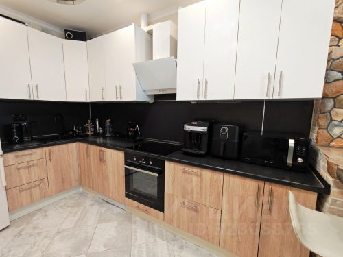 На кухне располагается угловой кухонный гарнитур, выполненный на заказ. Большое количество пространства для хранения, вместительные выдвижные ящики с металлическим каркасом, колонна под встроенный духовой шкаф (Zigmund & Shtain, сенсорный), ниша под холодильник (LIEBHERR), посудомоечная машина, удобная варочная панель нестандартных габаритов (Zigmund & Shtain, сенсорная), монолитная столешница из искусственного камня с интегрированной раковиной, фильтр для воды. Также, на кухне расположена обеденная зона и выход на лоджию, объединяющую два помещения.