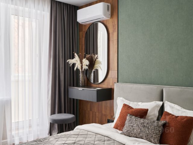 Проходная комната с раскладывающимся диваном, ТВ зоной, установлен вместительный шкаф. Несколько сценариев освещения за счет двигающихся плафонов освещения.