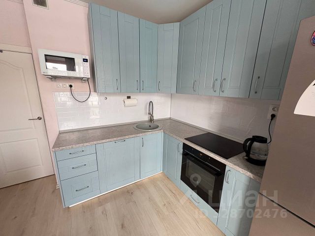 Кухня 10м2, комната 19м2, разделена межкомнатной раздвижной перегородкой-купе с двухспальной кроватью в спальне и диваном в зоне гостиной. Вся мебель новая.