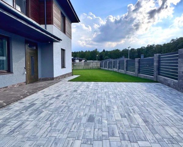 На участке по периметру высажены крупные туи, газон, большая замощенная площадка перед домом, декоративный фонтан.