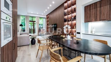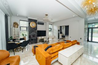 ID 2654 Таунхаус в современном стиле под ключ в клубном ЖК "Футуро парк" Превосходный дом с 5 спальнями, общей площадью 239 м.², расположен на видовом участке 1.93 соток. Удобная планировка продумана до мелочей. На первом этаже: гардероб, совмещённая кухня - гостиная с "островом", обеденная зона с выходом на террасу, санузел, кладовка, прачечная. На втором этаже: спальня для девочки со своими санузлом и большой отдельностоящей ванной около окна, спальня с двухъярусной кроватью для мальчика, игровая-гостевая комната с раскладным диваном, санузел с ванной. На третьем этаже: мастер-спальня со своими санузлом с душем и отдельностоящей ванной около окна, просторной гардеробной с "островком", отдельная комната, которая может служить дополнительной спальней. 4 этаж: кабинет, выход на эксплуатируемую крышу, где есть душ, 2 шезлонга, уличная мебель (диван и стол). На эксплуатируемой кровле уложен искусственный газон с растениями, а также установлена выезжающая маркиза с пультом управления для защиты от солнца. Ремонт делали для себя с особым вниманием к каждой детали строительства, качеству используемых материалов и мебели. Избегали ДСП, выбирая только широкоформатную плитку. Роскошный интерьер дополнен стильной мебелью. Таунхаус очень уютный и светлый. Панорамное остекление визуально увеличивает внутреннее пространство. Центральные коммуникации позволяют с комфортом жить за городом круглый год. Есть возможность подключить интернет, кабельное ТВ и телефон. В доме установлена сантехника известного бренда "Villeroy & Boch". Кондиционеры поддерживают оптимальную температуру воздуха в комнатах. Шторы на электроприводе. На 1-м этаже и во всех санузлах предусмотрены тёплые полы. Монтирована система очистки воды на кухне и в бойлерной. Для дополнительной безопасности в гостиной, детских комнатах и игровой установлены камеры видеонаблюдения. После трудового дня будет приятно расслабиться в массажном кресле. На участке обустроена механизированная терраса, все стены и крыша которой открываются с пульта управления. На террасе предусмотрено освещение и звуковое оборудование, чтобы наслаждаться музыкой и устраивать душевные посиделки. Терраса укомплектована грилем и всей необходимой мебелью - будет удобно готовить блюда на углях и накрывать на стол. По периметру участка высажены туи, создающие приватную атмосферу. На участке аккуратно уложен газон. Клубный ЖК "Футуро парк" находится в престижном и экологически чистом Истринском районе подмосковья, в 20-25 минутах езды от Столицы по скоростному Новорижскому шоссе. Стеклянные фасады таунхаусов, декорированные деревом, являются изюминкой посёлка. Архитектура КП становится словно гармоничным продолжением естественного ландшафта. Из окон открываются вдохновляющие виды на посёлок. На ухоженной зелёной территории КП создан прекрасный парк с живописным водоёмом и пляжем для купания. В посёлке планируется собственная инфраструктура: детский сад, школа, медицинский центр, развлекательный комплекс с рестораном, фитнес-клубом и бассейном. Организованы гостевые парковки. Жителям "Футуро парка" также доступна развитая инфраструктура Новой Риги и соседних посёлков, входящих в группу "Villagio". Рядом работают рестораны, аптеки, супермаркеты "Азбука вкуса" и "Перекресток". Всего за 5 минут на машине получится доехат