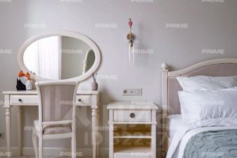 Мастер-спальня: две гардеробные комнаты, кровать 220/240, стена с ТВ отделана паркетной доской, тумба для ТВ сделана на заказ, покрыта серебряной фольгой, стена из кирпича покрыта серебрянкой, система звука Monitor Audio с возможностью слушать музыку и радио в гардеробных и с/у;