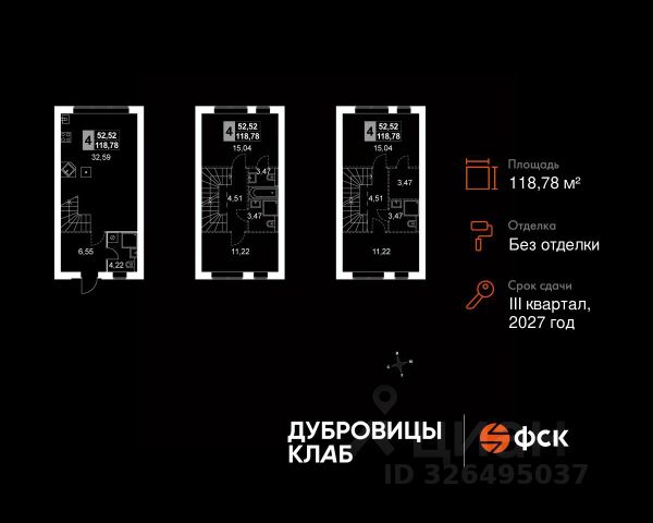 Прямая продажа от застройщика! Загородный жилой комплекс комфорт-класса. Продаётся 4-к таунхаус 6 общей площадью 118.78 кв.м. Без отделки. Расположение комплекса: "Дубровицы Клаб" — это современный малоэтажный комплекс комфорт-класса, который сочетает в себе атмосферу уюта загородной жизни и все преимущества развитой городской инфраструктуры. В проекте представлено два формата жилья - комфортные таунхаусы и эргономичные квартиры. Территория "Дубровицы Клаб" приватные зелёные дворы без автомобилей, школа, детский сад и спорткомплекс с бассейном. Транспортная доступность: - 20 минут на машине до станции МЦД "Подольск" - 50 минут на машине до МКАД - 50 минут на машине до ст.метро Улица Скобелевская Внутренняя инфраструктура: "Дубровицы Клаб" объединяет динамику городской жизни и спокойствие природы, создавая пространство, где работа и отдых, движение и умиротворение сливаются в единый поток — в жизнь, наполненную балансом и вдохновением. Место силы — это философия жизни, воплощённая в благоустроенной среде загородного комплекса "Дубровицы Клаб". Здесь всё создано для восстановления энергии и гармонии: прогулочные маршруты, зоны отдыха, воркаут-площадки и природные пространства, плавно переходящие в уют жилых кварталов. Для удобства жителей на территории комплекса открыта торговая галерея, где собрано всё необходимое: супермаркет, аптека, зоомагазин, винный бутик, лавка деликатесов, пекарня, химчистка и дом быта.