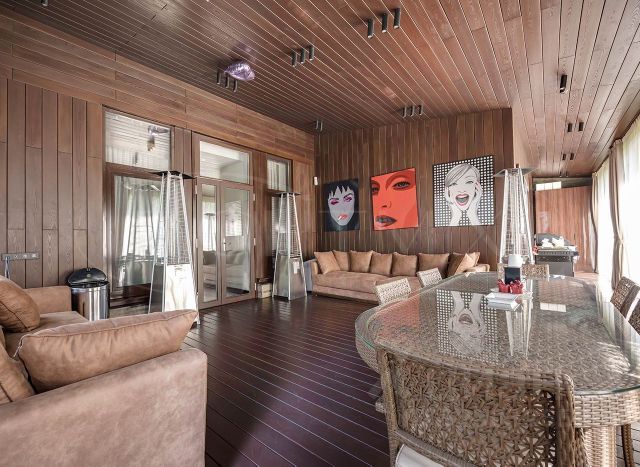 Кирпичные стены, цементная штукатурка, фасад из термоясеня.