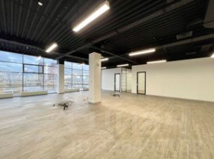 Офис с видом на улицу, панорамное остекление.