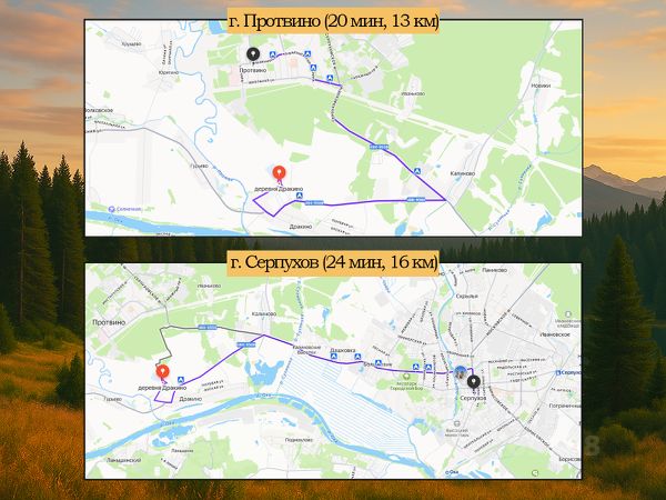 Деревня окружена лесами и полями, неподалёку протекает река, а до Серпухова — всего 10 минут на машине.