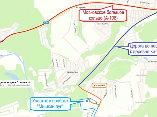 От "Московского большого кольца" (А-108) до деревни Калянино около 4 км по качественной асфальтированной дороге, ведущей к правительственному объекту (она всегда будет чистой и в отличном состоянии). Далее от деревни 0,6 км по дороге с твёрдым покрытием (см. схему).