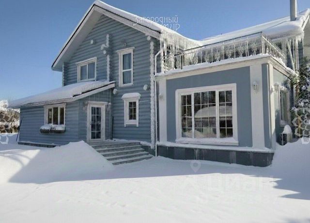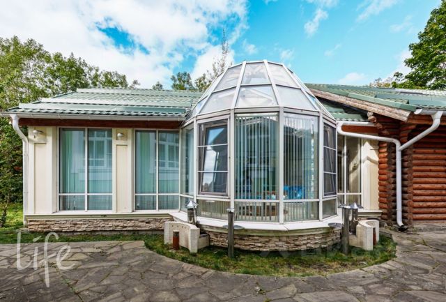 Дом в 2 этажа из оцилиндрованного бревна с монолитным цокольным подвалом, фактически — дополнительным этажом, снаружи оштукатурен и покрашен. Общая площадь дома 407 кв. м, по документам — 390 кв. м. Пристроена зона кухни из керамического блока. Мягкая кровля для хорошей звукоизоляции. Качественные пластиковые стеклопакеты REHAU.