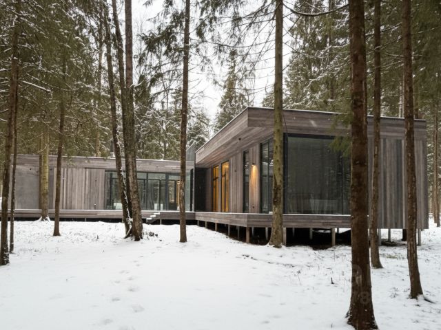 1-й этаж: кухня-гостиная с выходом на веранду, камин, две комнаты, гардеробная, санузел с душем, бойлерная, холл, коридор. Теплые полы в санузлах и прихожей. Кухня оборудована бытовой техникой Neff, сантехника Jacob Delafon. На полу дубовый паркет, лестница монолитная, ступени массив дуба. Кухонная мебель финская, массив берёзы.