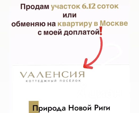 Предпочитаемый способ связи(собственник): @sky_destroyer Один из лучших участков КП Валенсия: укромный, удалённый от КПП и разъездов, один из 5ти участков с выходом в лес. Покупали для себя. Если вам важно уединение, природа и комфорт Новой Риги - это ваш выбор. ОБ УЧАСТКЕ: - ! Участок максимально удалён от шоссе (нет шума) - ! Выход в лес - Нет плотного окружения как у других участков (соседи только c двух сторон, один из них владеет двумя участками, так что его дом не будет вплотную) - ! Укромное расположение внутри посёлки - максимально удалено от КПП, будет тихо - Без подряда. Можно начинать строительство - Один собственник, обременений нет О ПОСЁЛКЕ: - ! 25 км от мкад, очень быстро добираться из города - ! Комфорт класс - ! Уже активно застраивается - ! Есть потенциал роста цена - когда посёлок будет полностью застроен и возведены объекты инфраструктуры - Огороженная территория и контроль доступа (КПП) - Газификация - Центральное водоснабжение - Электричество 15 кВт - Хороший вариант как для жизни, так и для перепродажи (готовые дома продаются по 30-40 млн р) О ЛОКАЦИИ: - ! Рядом КП Новорижский - премиум класс, приятное статусное соседство - ! Одна из самых экологичных локаций - ! Вся инфрастуктура Новой Риги:Рядом расположены Novaya Riga Outlet Village и рынок фермерских продуктов "Бессарабка". Здесь же вы найдёте множество кафе и ресторанов, среди которых "Кофемания", "Моремания", "Дядя Пицца", караоке-ресторан "Покровский" и другие. Также есть фитнес-центр World Class, магазины "Азбука вкуса", "Пятёрочка", "Мираторг". Кроме этого, есть сервисы вызова такси, каршеринг, доставки товаров и готовой еды. Детсад "Пчелка" - 2,2 км, детсад "Дивный сад" - 1 км, Покровская школа - 2 км. Рядом горбольница и аптеки. Спорткомплекс Лужки-клуб - это бассейн, горнолыжный центр, ледовая арена, футбольный клуб и каток. Есть конно-спортивный комплекс, зоосад.