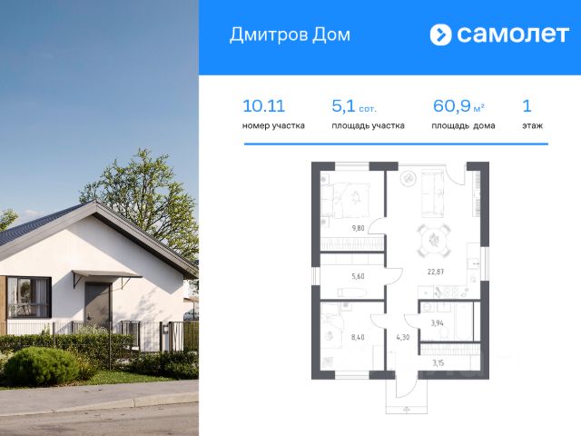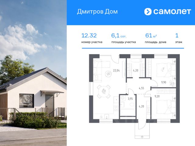 В продаже дом площадью 61,03 м2 на участке 6.1 от застройщика "Самолет" в загородном проекте "Дмитров Дом". Функциональная планировка, большие окна и высокие потолки. Дом без отделки. В базовую комплектацию включена металлическая входная дверь, двухкамерные стеклопакеты. Отсутствие межкомнатных перегородок позволит вам адаптировать пространство под себя. Все коммуникации заведены в дом: электричество, газ, канализация, водопровод и интернет. Участок благоустроен: газон, забор по периметру с калиткой и откатными воротами, подготовленное парковочное место для автомобиля. Предусмотрена ливневая канализация (ливневка), что защитит участок от подтоплений. Вы ощутите комфорт жизни в собственном доме и удобство городской инфраструктуры в окружении живописных пейзажей. На территории "Дмитров Дом" расположены: Административное здание (УК) Торговый центр и магазины Банно-оздоровительный комплекс Досуговый и детский центры Коворкинг Школа и детские сады Поликлиника Спортивный центр Игровые и спортивные площадки для взрослых и детей Водоем с собственной живописной набережной Круглосуточная охрана и видеонаблюдение Расположение: 60 минут до Москвы на автомобиле 1 час 20 минут на электропоезде от Савеловского вокзала 10 минут до центра г. Дмитрово Покупка по 214-ФЗ по ДДУ, что гарантирует надежность и прозрачность сделки. Выгодные варианты покупки: 1. Семейная ипотека от 5,9%, ПВ от 20,1% 2. Рассрочка на 2 года с первым взносом от 15%. Приглашаем Вас в офис продаж на презентацию проекта ежедневно с 10.00 до 20.00. Предварительная запись на визит по телефону.