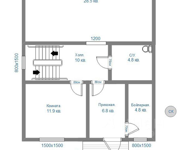 В доме на первом этаже: очень светлая просторная гостиная, комната, большая ванная комната и санузел, котельная, просторный холл, и красивая удобная лестница на 2 этаж из метало каркаса с отделкой дерева.