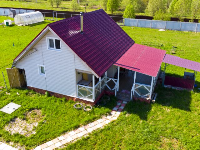 В доме две спальные комнаты, гардеробная, бойлерная, совмещенный санузел, кухня с гостиной с выходом на террасу. По всей площади дома и бани водяной теплый пол. Толщина стяжки теплого пола 14 см. На полу плитка керамогранит. Печь камин из кирпича ручной формовки. Очень теплоемкая и энергоэффективная. Печь делал опытный печник во втором поколении. Внутри дома частично стены обшиты имитацией бруса и частично штукатуркой. Окна пластиковые хауберг. Входная дверь уличная зимняя с терморазрывом.