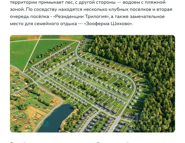 Описание коттеджного поселка: Коттеджный поселок бизнес-класса Резиденции Трилогия — место, где можно забыть о каменных джунглях мегаполиса, почувствовать свободу и отдохнуть на собственной земле, не жертвуя привычным городским комфортом..