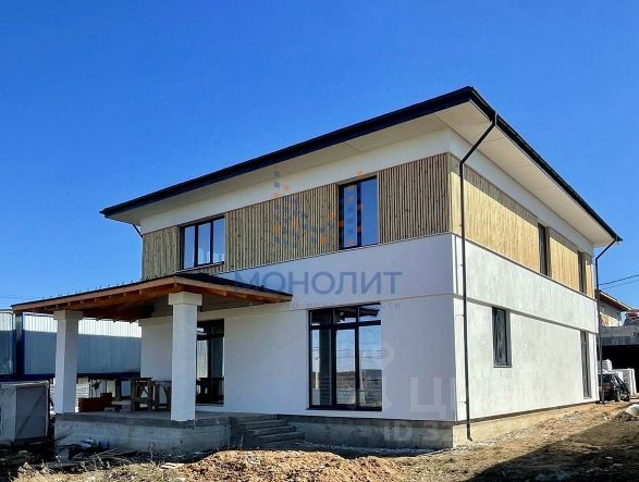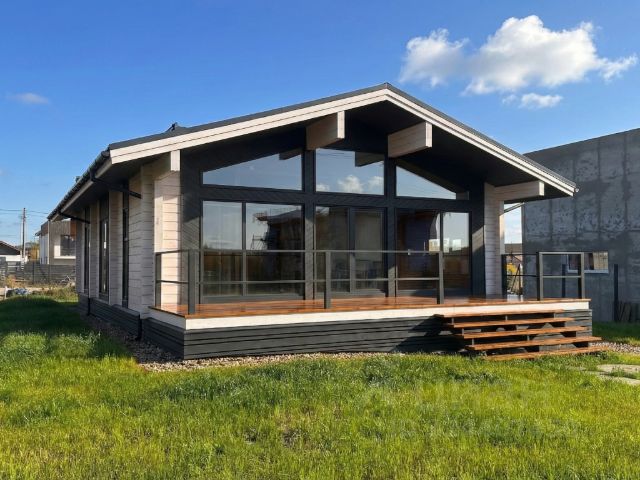 Дом из газосиликатного блока Bonolit, снаружи отделан термопанелями с клинкером Парадис (есть возможность исполнения в клинкере серого цвета), кровля металлочерепица производства Grandline, установлены пластиковые окна Rehau, установлено внешнее освещение дома. Гарантия от строительной компании на все узлы дома — 1 год!