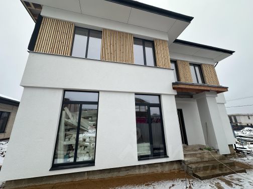 Дом из газосиликатного блока Bonolit, снаружи отделан термопанелями с клинкером Парадис, кровля металлочерепица производства Grandline, установлены пластиковые окна Rehau, установлено внешнее освещение дома.