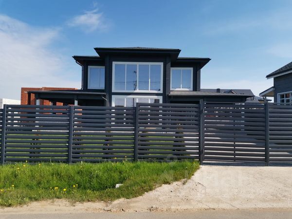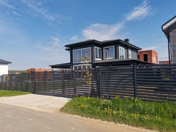 Участок огорожен забором из металлического евроштакетника высотой 2 м., в единой стилистике коттеджного посёлка, выполнена парковка на 2 автомобиля, входная группа с распашными воротами и калиткой.