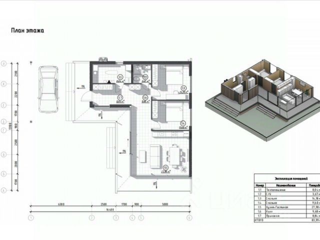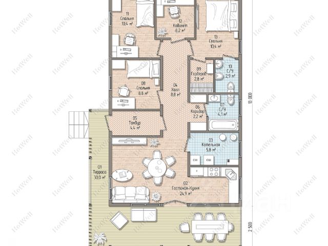 3 спальни, 3 санузла, гостиная с камином, котельная, террасы