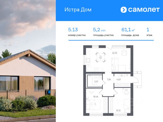 В продаже дом площадью 61,11 м2 на участке 5.22 от застройщика "Самолет" в загородном проекте "Истра Дом". Функциональная планировка, большие окна и высокие потолки. Дом без отделки. В базовую комплектацию включена металлическая входная дверь, двухкамерные стеклопакеты. Отсутствие межкомнатных перегородок позволит вам адаптировать пространство под себя. Все коммуникации заведены в дом: электричество, газ, канализация, водопровод и интернет. Участок благоустроен: газон, забор по периметру с калиткой и откатными воротами, подготовленное парковочное место для автомобиля. Предусмотрена ливневая канализация (ливневка), что защитит участок от подтоплений. Вы ощутите комфорт жизни в собственном доме и удобство городской инфраструктуры в окружении живописных пейзажей. На территории Истра Дом расположены: Административное здание (УК) Торговый центр и магазины Банно-оздоровительный комплекс Досуговый и детский центры Коворкинг Школа и детские сады Поликлиника Спортивный центр Игровые и спортивные площадки для взрослых и детей Водоем с собственной живописной набережной Круглосуточная охрана и видеонаблюдение Расположение: 60 минут до МКАД на автомобиле по Новорижскому шоссе 1 час 40 минут до Москвы на общественном транспорте 15 минут на автомобиле до Истринского водохранилища 10 минут на автомобиле до ж/д вокзала "Румянцево" Покупка по 214-ФЗ по ДДУ, что гарантирует надежность и прозрачность сделки. Выгодные варианты покупки: 1. Семейная ипотека от 5,9%, ПВ от 20,1% 2. Рассрочка на 2 года с первым взносом от 15%. Приглашаем Вас в офис продаж на презентацию проекта ежедневно с 10.00 до 20.00.