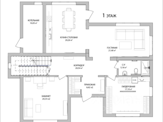 1 этаж: холл-прихожая, с/у, кабинет, гостиная, столовая с выходом на террасу, кухня, отдельная зона для персонала: спальня, кухня, су, гараж на 2 м/м.