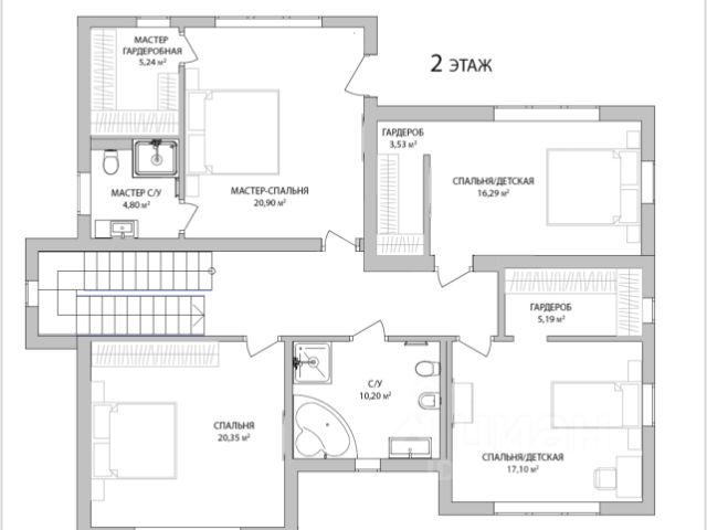 2 этаж: 2 гостевые спальни, с/у, комната родителей с мини кухней, детская спальня с игровой зоной, с/у, мастер блок: гардеробная, спальня, ванная комната.