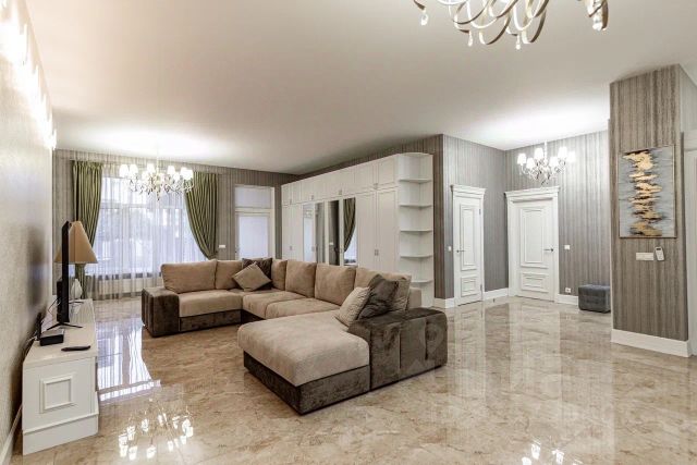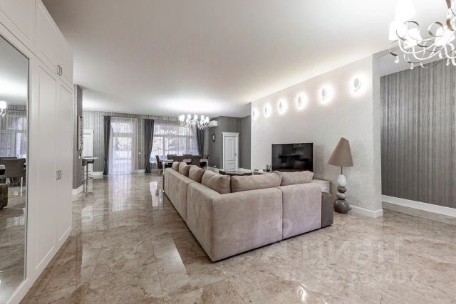 Открытое пространство гостиной, совмещенное с кухней (можно изолировать), площадью 120 кв.м с выходом из гостиной на террасу и выходом из кухни на участок. Дополнительно 6 изолированных комнат (из которых 3 мастер-спальни с санузлами), 6 санузлов.