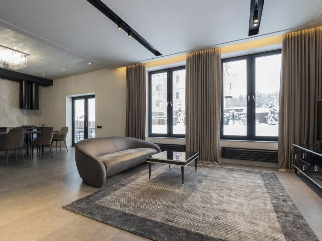 Отдельного акцента заслуживает планировка дома. Дом двухэтажный. Все пространство эргономично спланировано. Совмещенная кухня-гостиная позволит проводить теплые уютные вечера в семейном кругу, а в летнее время можно наслаждаться ужином на террасе. Также на первом этаже есть кабинет с выходом на индивидуальную террасу. Второй этаж отведен для спален.