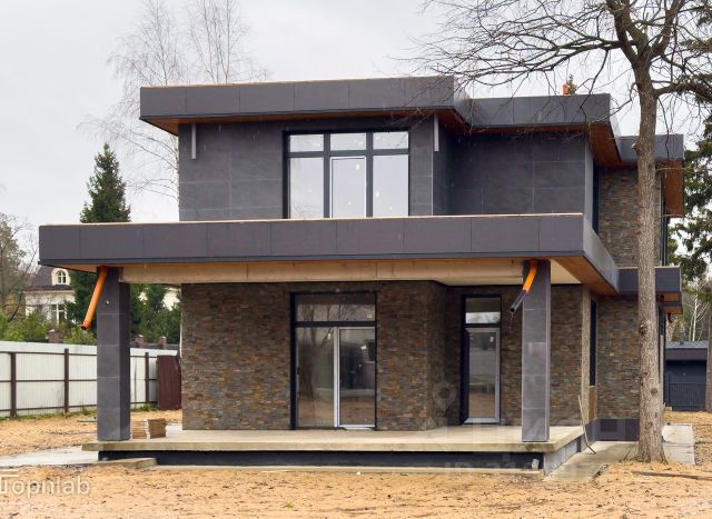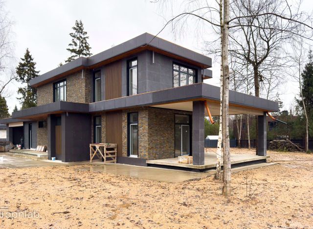Фасад дома отделан клинкерным кирпичом, мрамором и лиственницей.