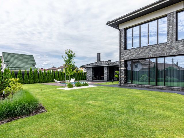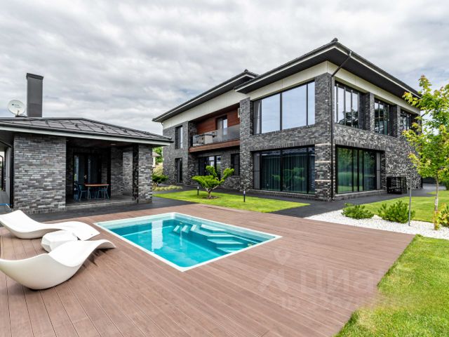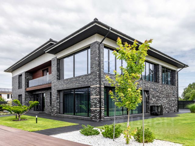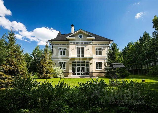 На лесном участке 55 соток с ландшафтным обустройством, на котором растут вековые сосны, расположена загородная усадьба площадью 1500 метров.