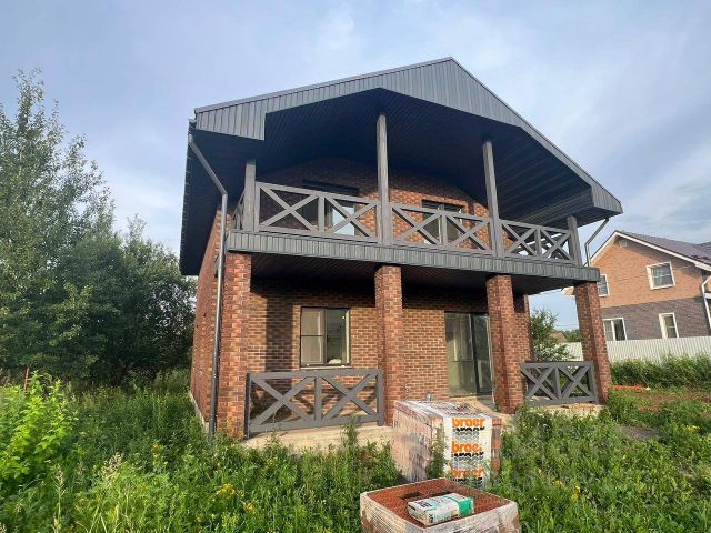ДОМ С РЕМОНТОМ ПОД СЕМЕЙНУЮ ИПОТЕКУ. (с газом и ремонтом под ключ). ДОМ ГОТОВ К ЗАСЕЛЕНИЮ. Фундамент: Армированный, бетонный столбчато-ленточный. Глубина свай 1,5 м . Высота ленты, общая 120 см по среднему уровню., ширина 43 см. Бетон заводской марка 300 Кровля: Металочерепица тип Монтерей, цвет серый графит. Утепление минвата 200 мм Пол террасы: армированная стяжка, плиткой не комплектуется. Стены: Газобетонные блоки, производство PORITEP (250/300/625). Армирование металлической сеткой. Облицовочный кирпич, производитель компания Брайер, цвет кора дуб, этна. Утепление пенопластом толщина 50 мм. Швы пропенены. Перегородки: 1,2-й этаж блок. Окна: Двухкамерные стеклопакеты (3 стекла) , MELKE Пол первого этажа: Армированная стяжка Пол второго этажа: Бетонные плиты. Потолок натяжной с установленным контрольным люком. Напольное покрытие: 2-й этаж ламинат , 1-й этаж плитка, в санузлах плитка на стенах и полах. В помещениях с уложенной плиткой выполнен электрический или водяной подогрев полов с теплорегуляторами, в зависимости от принятой схемы продавцом. Лестница: сосна Двери: межкомнатные двери цвет светло серый Электрика: Розетки, выключатели, выводы под светильники с патронами. Электрический щиток в сборе вводной, подведение к дому по земле бронированным проводом. Выполняется вся разводка по дому В каждой комнате: выключатель, 3 двойных розетки, вывод под люстру( одна точка с патроном за исключением кухня гостинная две точки) Водоснабжение: скважина с адаптером, сделано подведение холодной воды в дом в траншее на глубине 150 см, устанавливается насос , фильтр для грубой очистки воды, выполнена разводка воды во все сан узлы и кухню , для горячей воды устанавливается водонагреватель 80 л. Вода техническая. Септик: автономного типа на 5 человек. Сантехника: Унитаз, кран, тюльпан устанавливается в санузле первого этажа. Отопление: Газовый 12кВ, радиаторы, расширительный бак. В системе залита тех. Вода. Выполнена разводка отопления по дому. Газ в дом ЗАВЕДЕН. В санузлах вместо батарей отопления могут устанавливаться электрические полотенцесушители, в зависимости от принятой схемы продавцом. Вентиляция: Санузлы и кухня, вент выход на кровле. Продуманная планировка: просторная кухня-гостиная, 4 жилые комнаты и 2 с/у. Коммуникации: магистральный газ, электричество 15кВт, водоснабжение - скважина, канализация - септик. Участок прямоугольной правильной формы 8 соток. На участке стоить не большой деревянный дом на сваях используется как хоз блок или баня. Круглогодичный асфальтированный подъезд, постоянно проживающие соседи. Вся необходимая инфраструктура для комфортной жизни находится в 5 мин. езды в посёлке Софьино: продуктовые магазины, школа, сады, пункты доставки. Рядом с КП остановка общественного транспорта, откуда курсируют маршрутки до м. Котельники. Подходит под семейную ипотеку.